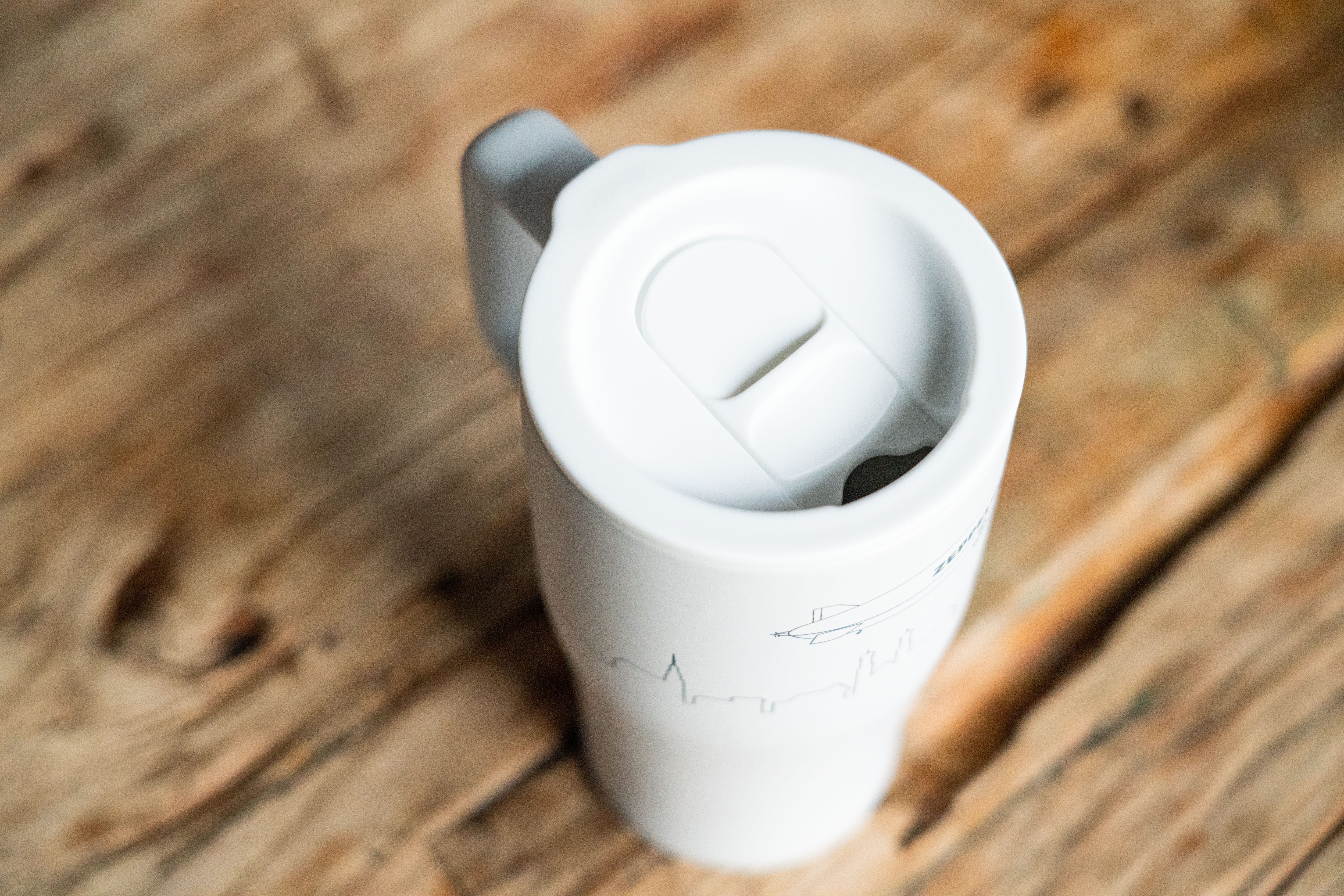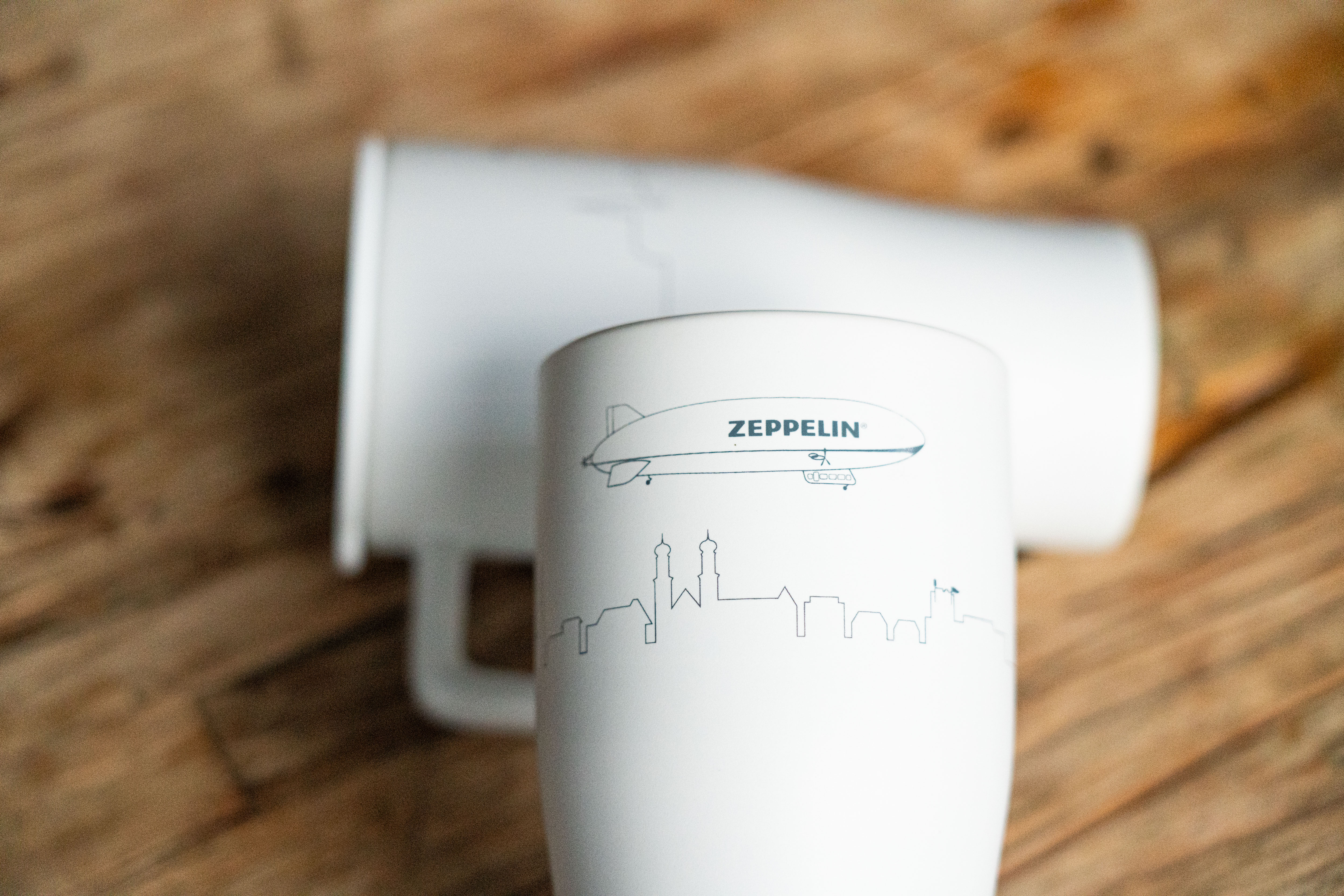 Ein besonderes Highlight ist der hochwertige Siebdruck in Dunkelgrau: Unser beliebtes Zeppelin-Motiv mit der Skyline von Friedrichshafen verleiht dem Becher einen exklusiven, zeitlosen Look. Die weiß matte Oberfläche unterstreicht das elegante Design.
