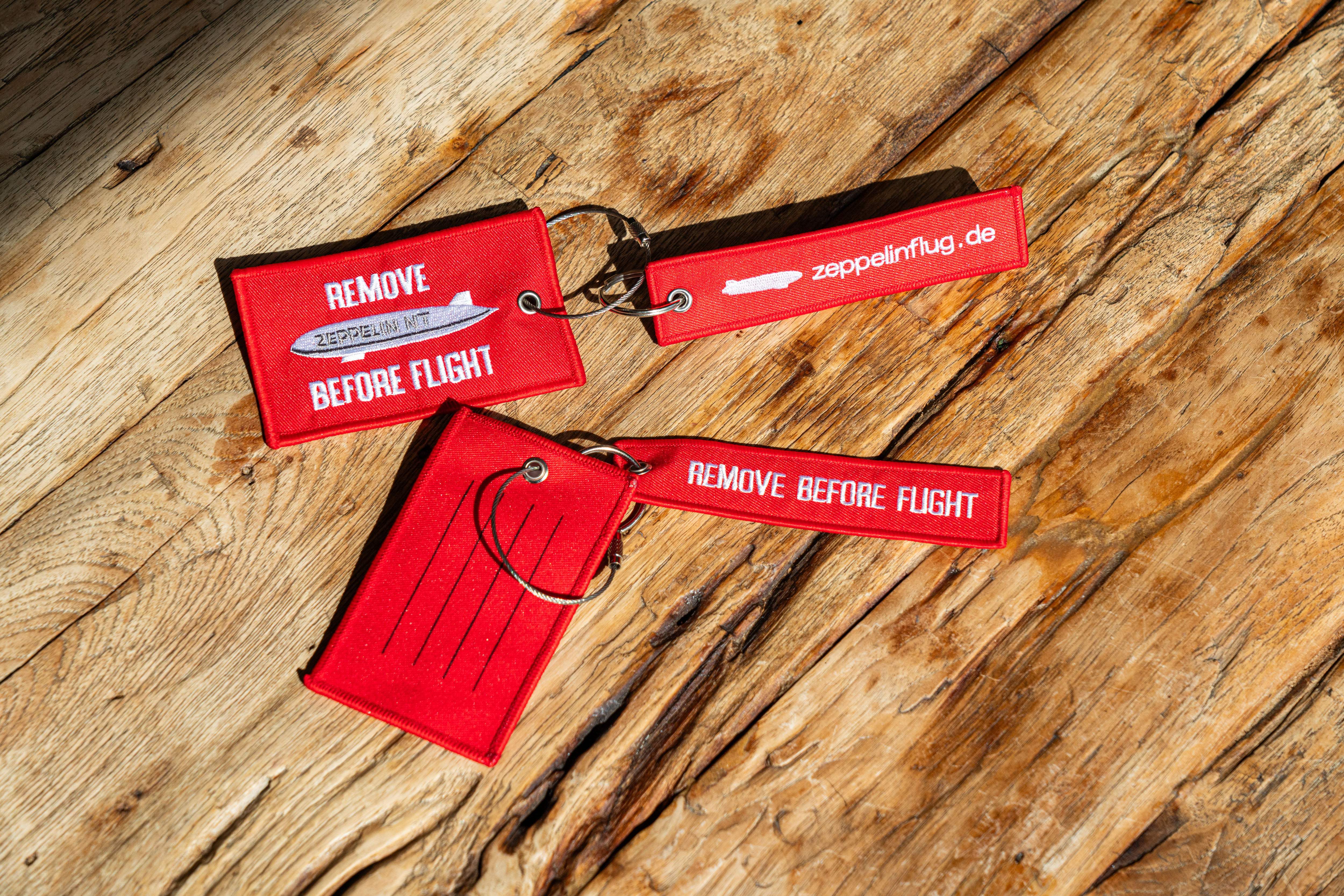 Schlüsselanhänger "remove before flight" Zeppelin NT, mit Ringverschluss, ca. 13 cm x 2,5 cm.