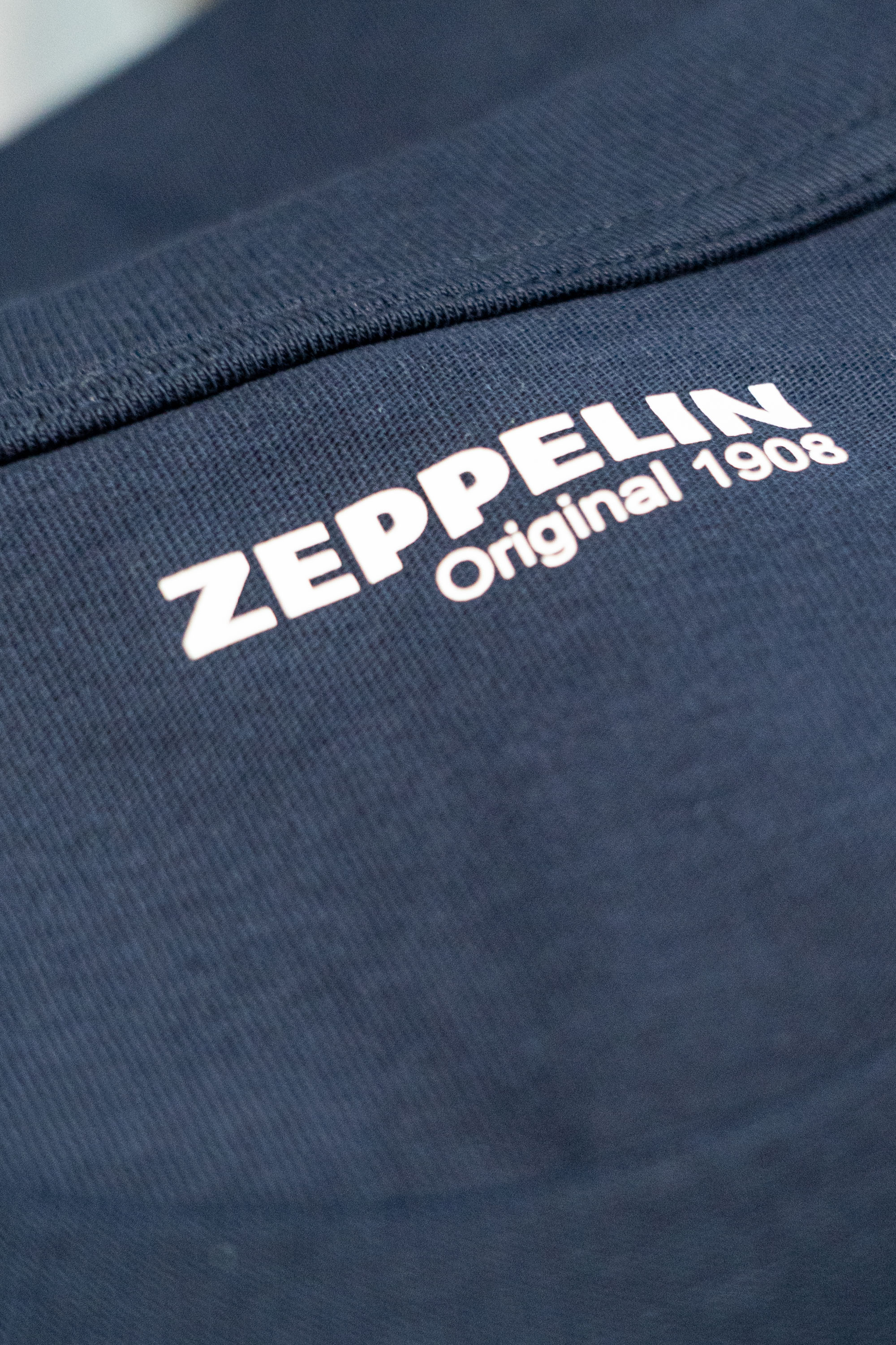 Auf dem Rücken findet sich eine originale technische Zeichnung des Zeppelin NT – per langlebigem Siebdruck aufgebracht. Auf der Brust ein stilisiertes Zeppelin-Shape. Das Label im Nacken ist ebenfalls per Siebdruck aufgetragen – so stört nichts beim Tragen.