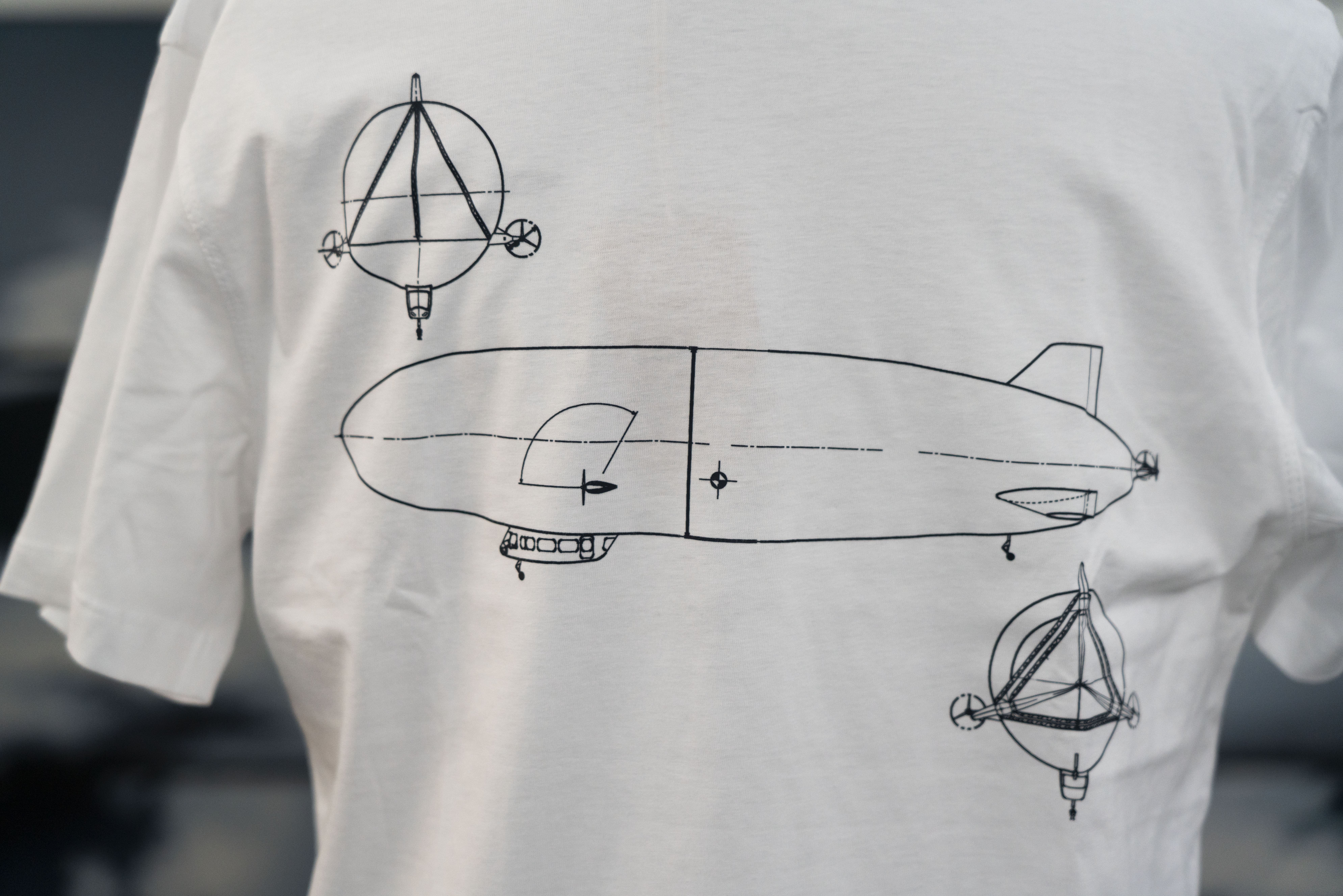 Auf dem Rücken findet sich eine originale technische Zeichnung des Zeppelin NT – per langlebigem Siebdruck aufgebracht. Auf der Brust ein stilisiertes Zeppelin-Shape. Das Label im Nacken ist ebenfalls per Siebdruck aufgetragen – so stört nichts beim Tragen.